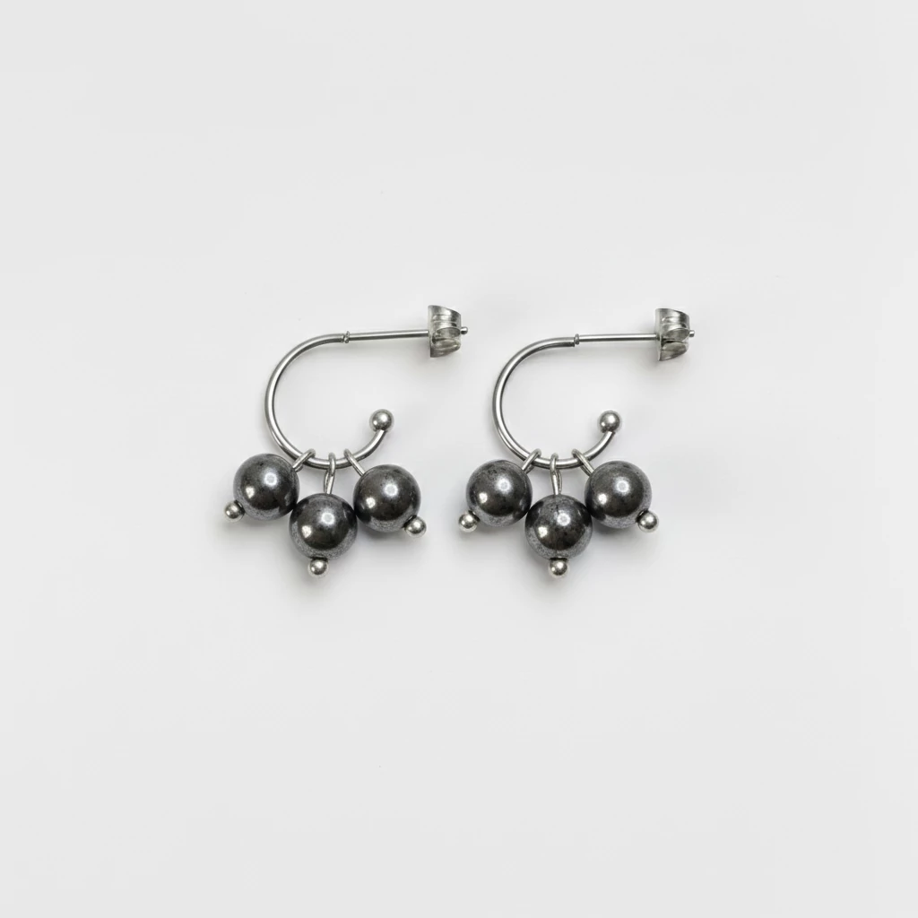 Trinity fülbevaló három darab hematit ásványgyöngyből készült, amelyek letisztult elrendezésben, egy nemesacél karikán függnek. A három gyöngy finom egyensúlyt alkot, kiemelve az ásvány természetes formáját és egyedi megjelenését.