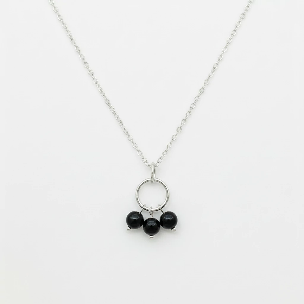 Trinity nyaklánc három darab ónix ásványgyöngyből készült, amelyek letisztult elrendezésben, egy nemesacél karikán függnek. A három gyöngy finom egyensúlyt alkot, kiemelve az ásvány természetes formáját és egyedi megjelenését.